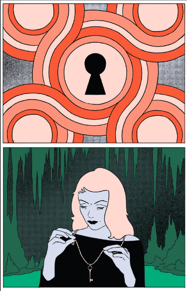 Romane : J’aime beaucoup travailler les motifs, et en l’occurrence dans le livre il y a un motif qui revient très souvent c’est le rond. C’est aussi un peu lié à l’histoire. Je voulais que cette histoire de perles, de souvenirs ça se retrouve aussi un peu partout, dans toutes les formes, les carrelages, c’est pour ça que ce motif se répète.