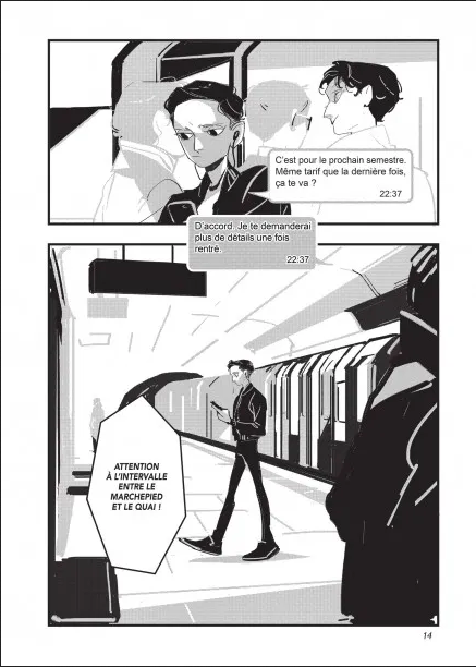 Ce jeu de fini-non fini qui donne du volume et une présence aux protagonistes, se retrouve aussi sur les décors mettant en avant certains éléments, tandis que d’autres sont traités sous forme géométrique. Un jeu de formes et de trames en niveau de gris qui crée un effet de focus parfait pour orienter le lecteur vers des indices visuels, des moments clefs, mais aussi de fausses pistes.