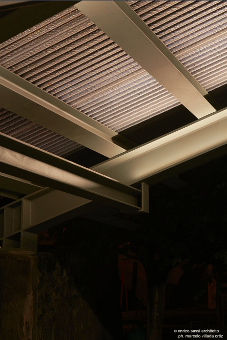 L'espace extérieur couvert est pavé de pierres naturelles (granit gris et porphyre de Cuasso al Monte) posées en bandes alternées de gris et de rose. La structure de l'auvent d'entrée est constituée de poutres métalliques HEB recouvertes de feuilles de polycarbonate ondulé transparent, ce qui rend l'espace situé en dessous lumineux et accueillant. L'auvent suit l'inclinaison du toit existant, prolongeant sa pente. La structure de l'auvent est ancrée d'un côté au nouveau volume en béton et de l'autre au sommet d'un ancien mur, qui a été conservé et intégré dans la conception. La poutre métallique principale de l'auvent dépasse le bord du mur et se révèle. La gouttière est constituée d'un solide profilé métallique en forme de V qui surplombe l'extrémité du toit ; l'eau de pluie tombe dans un puits rempli de pierres provenant de la rivière Verzasca, également utilisées pour l'aménagement extérieur.