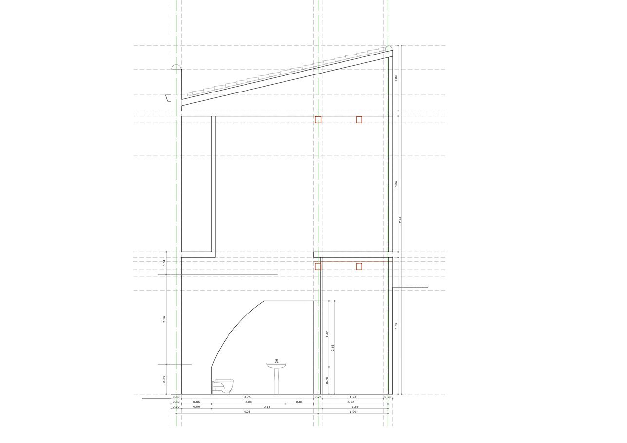 Le rez-de-chaussée conserve la poutre en bois existante et le sol en carreaux de céramique en guise de remplissage, tandis qu'un nouveau sol est construit au premier étage : la première travée est recouverte d'un sol mixte acier-béton qui expose la tôle et les poutres métalliques, modifiant profondément l'apparence par contraste avec ce qui existait auparavant ; et la deuxième travée, au-dessus de la salle de bains et de la cuisine, est recouverte d'un sol en bois situé à une plus grande hauteur par rapport au sol pour donner une impression d'espace. Le voyage se termine par le grenier dont le plancher incliné - le toit du bâtiment - auparavant caché par la canne, est maintenant exposé.