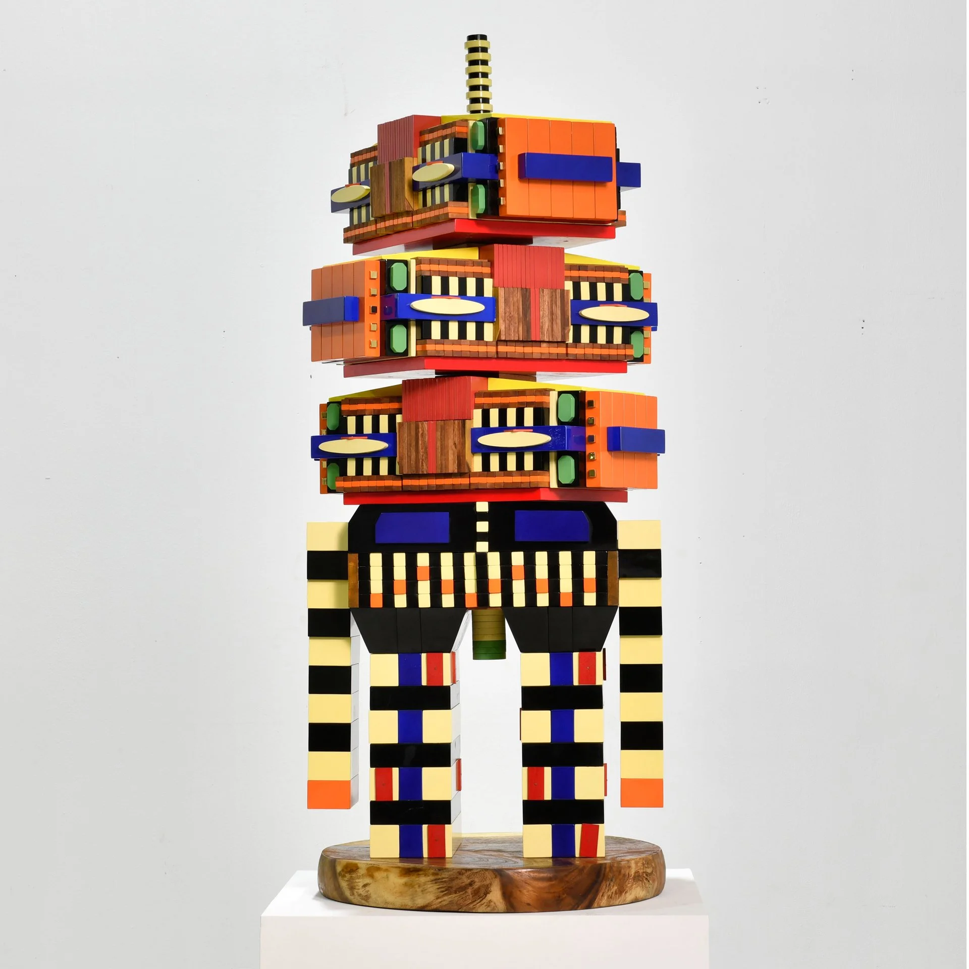 Kumkum Fernado - " Officiellement connu sous le nom d'Izah ", 950 blocs composés de bois recyclé, de bois peint à la main et à la bombe, de détails en laiton rayé et de clous recyclés, 31,5 x 56,2 x 21,5 pouces. Toutes les images © Kumkum Fernando, avec l'aimable autorisation de Jonathan LeVine Projects.