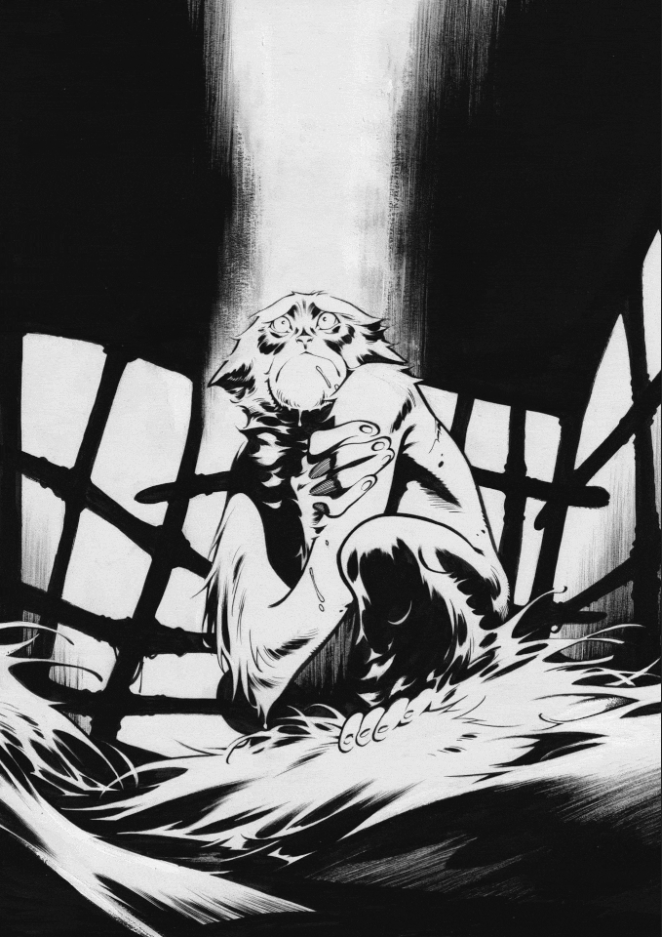 Et bien sûr, l’histoire : lorsque j’ai lu pour la première fois le scénario, j’ai passé de grands moments de bonheur simplement en tant que lecteur face à cette histoire complexe (et exigeante) de deux vengeances parallèles. Je me suis senti très chanceux d’être celui qui allait mettre en images cette épopée. Chanceux et un peu effrayé, car le scénario était très exigeant techniquement en raison de tous les défis que posait l’histoire. Par exemple, le fait que le personnage central, « Sans Voix », soit un singe était un autre défi à relever, car je n’en avais jamais dessiné. J’ai donc simplement dû apprendre à les dessiner. J’ai fait mes devoirs et je suis fier du résultat.
