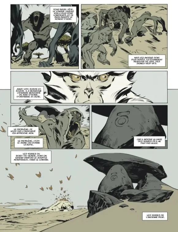 Alors pourquoi ces singes ? Ce que je mets dans le terme « heroic fantasy » —même s’il y a débat, beaucoup de gens disent que Le Dieu-Fauve n’est pas un album d’heroic fantasy—c’est un récit très primitif inspiré de Conan le barbare de Howard et un peu de La quête de l’oiseau du temps, même si cette dernière référence déjà plus dans le fantastique que dans l’héroic entendu au sens de ces combats primitifs entre barbares. J’associe aussi ces singes avec mon envie de parler de la fin d’une civilisation et le fait de revenir à des temps supposément primitifs, auxquels on associe le Déluge qui apparaît dans beaucoup de mythologies. C’est vers la fin que tout s’est cristallisé : mon envie de faire de l’heroic fantasy, l’arrivée des singes, Roger qui accepte et l’envie de parler de fins de civilisations très présentes dans mon esprit..