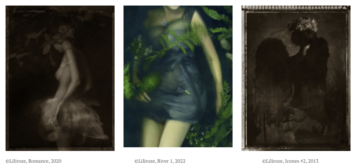 Liliroze peint en photographe ces forces tranquilles qui accomplissent le geste dans l’harmonie, séduite par le chant intérieur de ces poses, comme on peut imaginer Renoir, Degas, Ernest Renoux, Bonnard précédemment l’avoir fait; Peut-on rappeler que Fragonard (XVIII) Charpentier s’aidaient de bijoux, de fleurs pour rehausser le teint de leurs modèles, célébrer la carnation du beau, rehausser, donner profondeurs et présences aux visages, aux corps. Dois-je évoquer le portrait de Georges Sand par Charpentier, Ophélie par Léopold Burthe, 1852, ou l’empreinte émérite de ces peintres célèbres, Delacroix, Chassériau, Girodet, plus discrets, Cogniet, Burthe, Gigoux, qui ont inséminé la photographie de Liliroze dans ses références et dans son style inspiré du Romantisme.