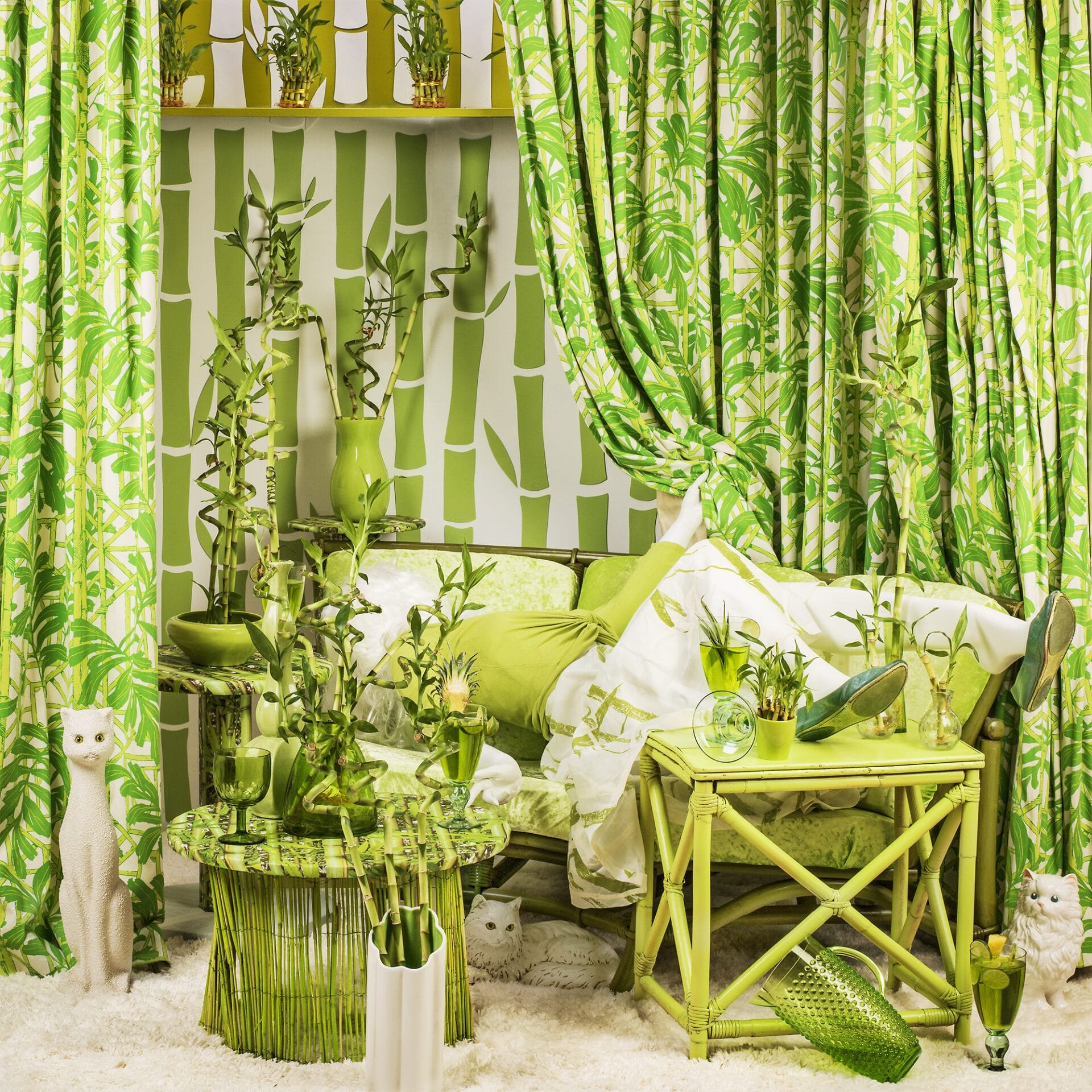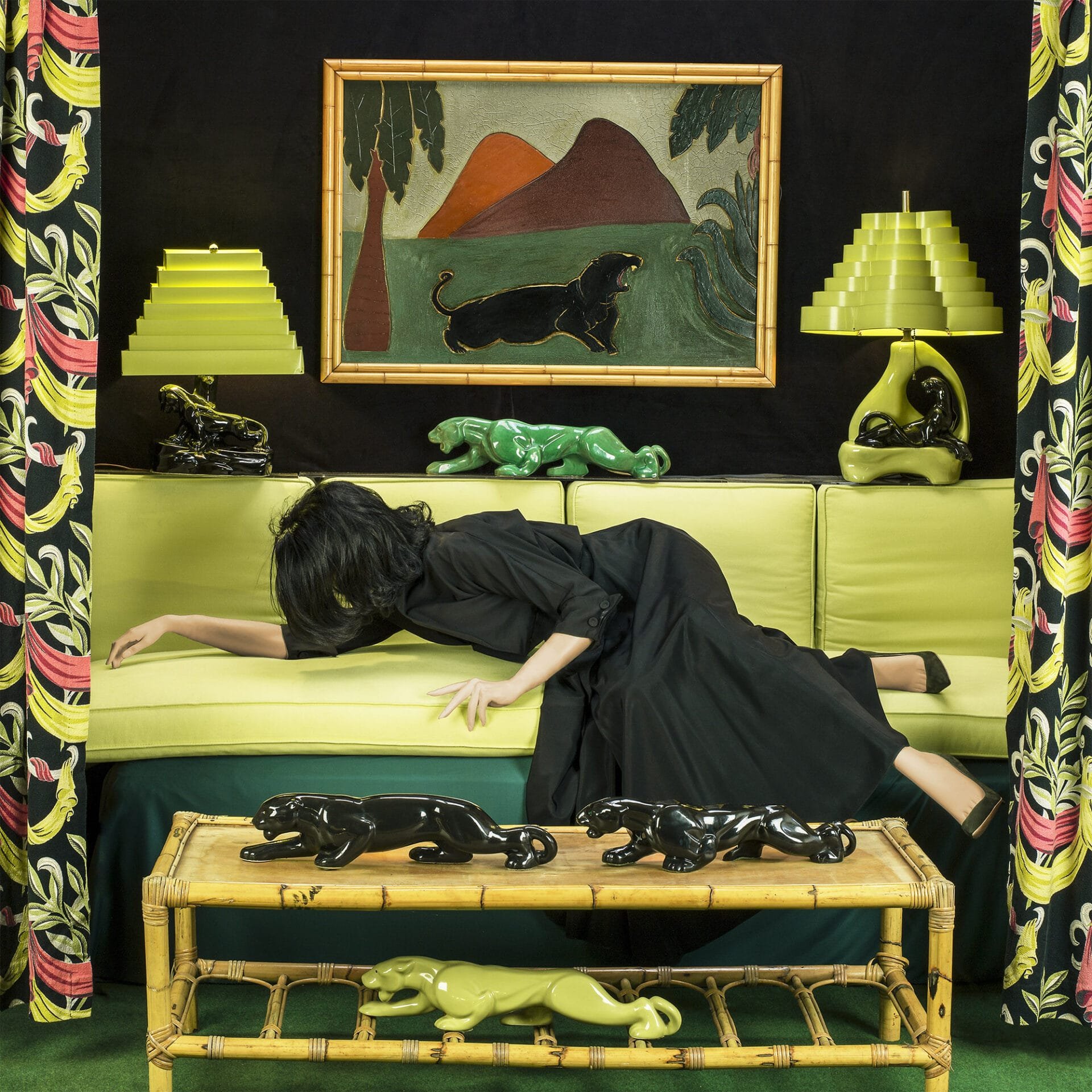 En revanche, la Femme anonyme de Carroll est souvent engloutie par son environnement, à la fois maladroite et complètement dépassée. «J'ai grandi dans un endroit où les rideaux étaient assortis au canapé ou aux couvre-lits, et la vie était censée être idéale avec 2,5 enfants parfaits, une belle mère et un père riche», explique Carroll. « Bien sûr, rien de tout cela n’était vrai, mais c’était le mythe de la vie parfaite. J’ai continué à faire la satire de cette illusion avec humour, couleur et beauté dans mes images.”