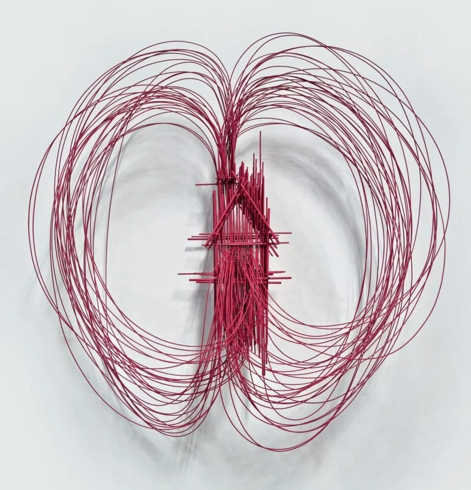 À partir de fines tiges d'acier, l'artiste barcelonais David Moreno construit des maisons imposantes et des villages en cascade qui reflètent l'architecture de nos vies. Il incorpore souvent des éléments anthropomorphiques et anatomiques, suggérant des squelettes ou des cœurs battants.