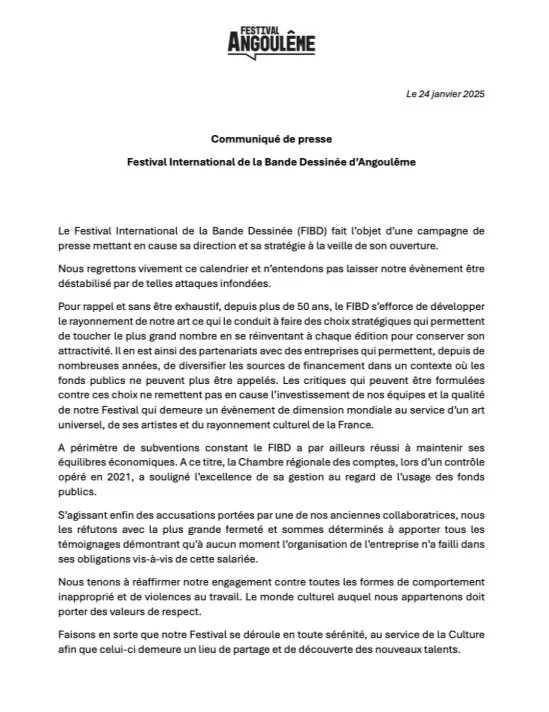 MAJ du 24 janvier 2025 : le Festival International de la Bande Dessinée d’Angoulême a publié un Communiqué de presse suite à la parution de cette enquête.