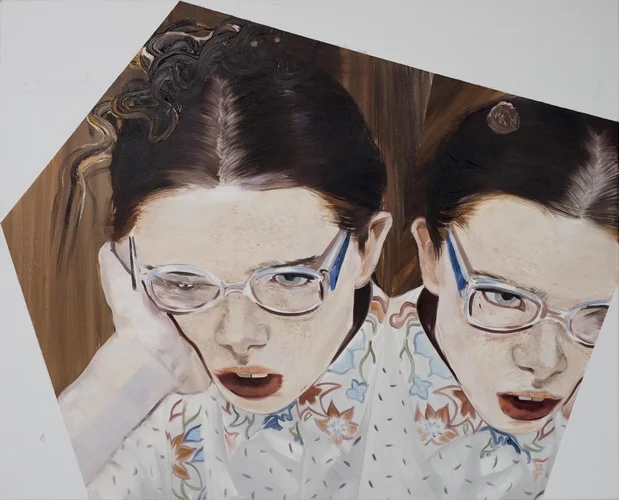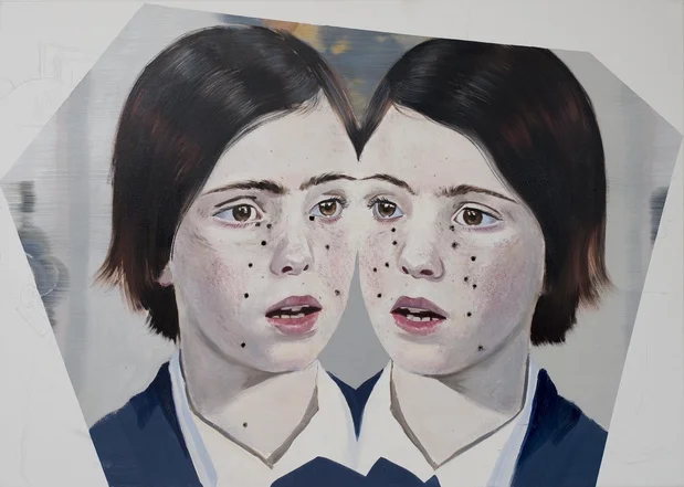 Agata Kus, Twins IV, 2015 Huile sur toile, brulures de cigarettes — 105 × 130 cm Courtesy of Maëlle Galerie, Paris