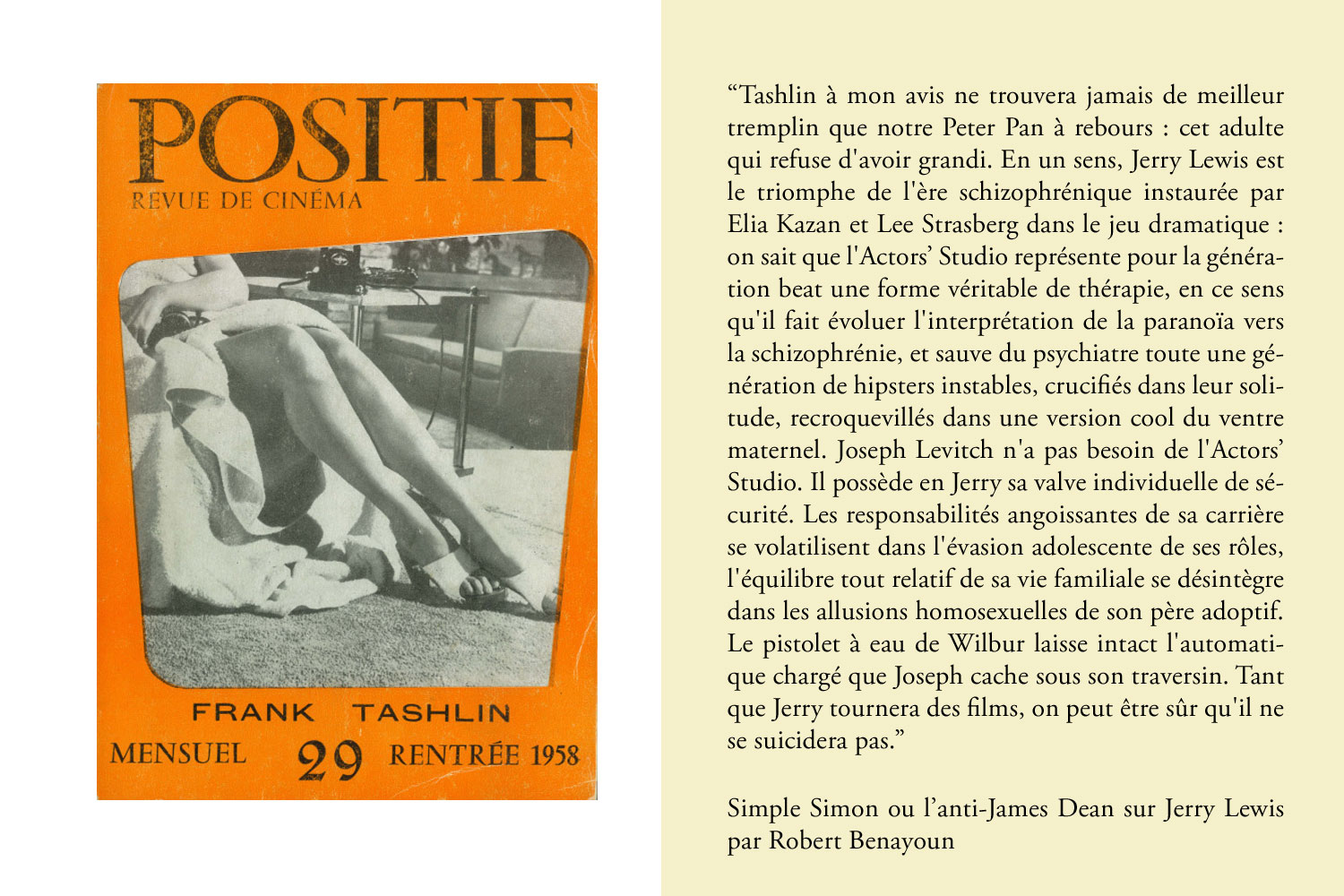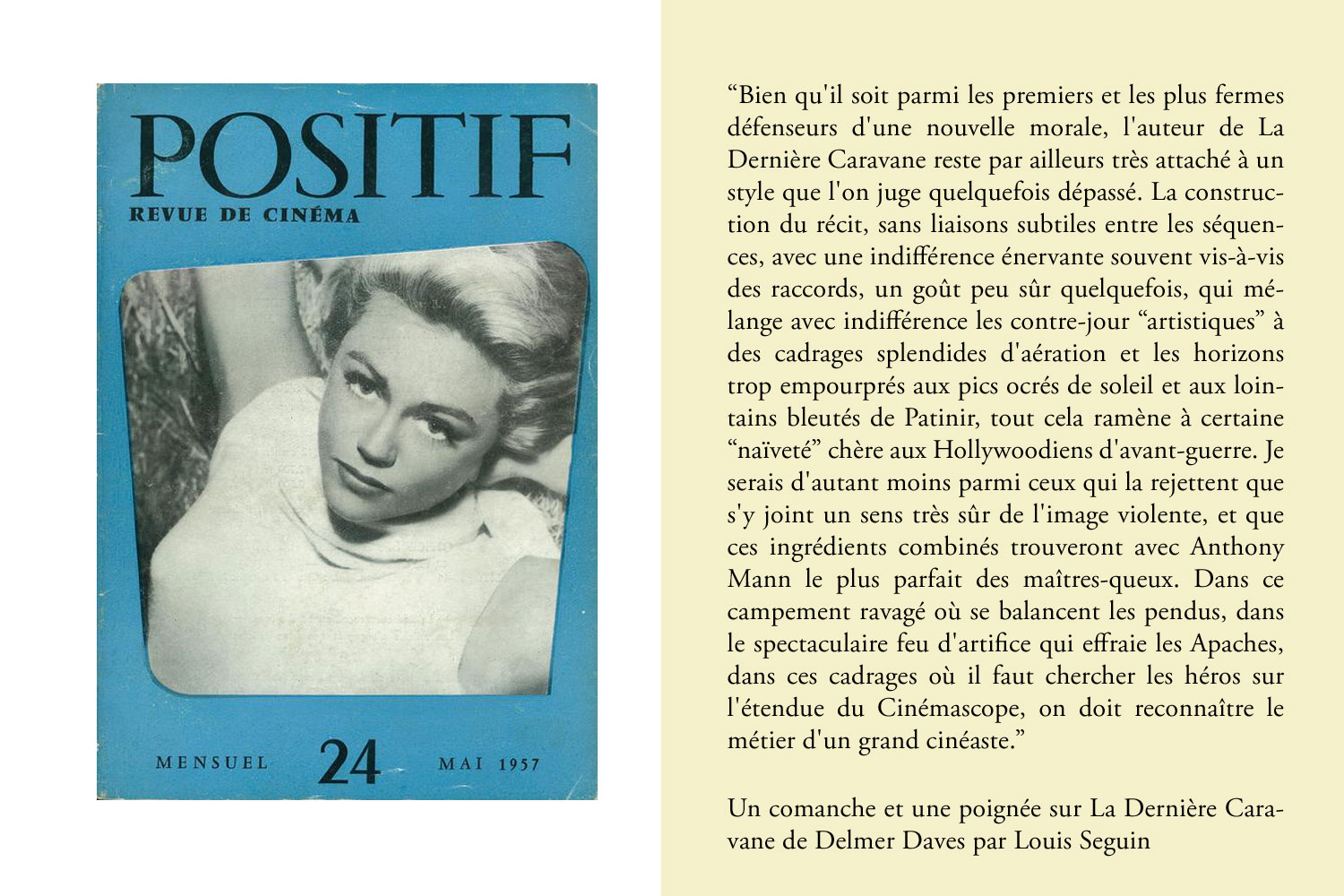 Au lieu de critiquer sans cesse les limites de l'internet, qui sont le plus souvent celles de l'internaute, c'est à dire les nôtres, nous devrions tous, nous autres nouvelle humanité connectée à deux clics potentiels du savoir universel, honorer et saluer plus souvent l'oeuvre immense accomplie dans l'ombre par les milliers de passionnés qui numérisent pour le bénéfice de tous ce qui a joué (et joue visiblement encore) un rôle essentiel dans leur vie : disques rarissimes, livres introuvables, oeuvres obscures, revues décisives, comme ont pu l'être Les Cahiers du Cinéma et Positif. Pour leur travail de numérisation, toujours en cours, nous remercions l'équipe des Cahiers Positifs, grâce à qui nous avons eu l'émotion de retrouver des vieux numéros de ces revues que les fameux hasards de la vie nous avaient faits perdre.