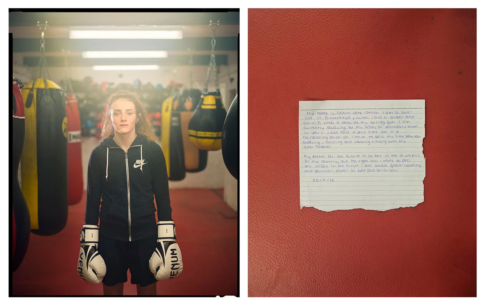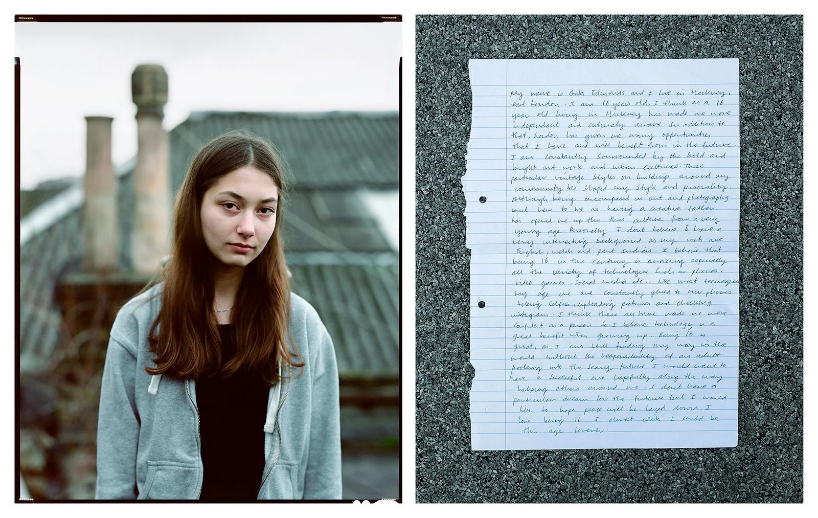 Sixteen se focalise sur ce que cette génération va devoir supporter des décisions politiques prises actuellement. Les premières images de la série ont toutes été réalisées au nord du Pays de Galles et à Liverpool pour dégager une vision en coupe de la société. Elles vont d'un cliché de jeune traveller à des photos de réfugiés Iraniens et syriens. A chaque prise, je demande à mon sujet d'écrire son témoignage, en vue de ne mettre aucun filtre entre lui et le futur spectateur de l'image. Le groupe a adopté cette structure d'image avec à côté un texte présentant le sujet; même si d'autres pratiques sont envisagées comme la vidéo ou l'audio- pour arriver au même résultat de présentation avec le cliché, en accompagnement.
