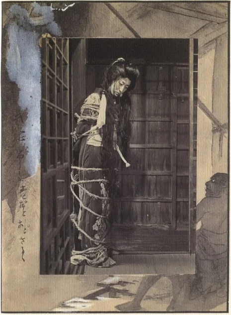Avant que le bondage ne devienne un forme de jeu érotique, il était employé durant la période Edo (1603–1867) pour contraindre et immobiliser les criminels et autres captifs. Mais c'est la version érotique qui fit la fortune de Ito. Et bien qu'il se soit marié plusieurs fois au fil de sa vie (humour!), il a aussi entretenu de nombreuses et longues relations avec d'autres femmes. Et elles furent bien sûr ses modèles privilégiés, autant pour ses photos perverses que ses peintures ou illustrations qui incluaient bien sûr les obligatoires suspensions … On y découvre ainsi, sur un cliché, Kise Sahara, sa seconde épouse enceinte jusqu'aux yeux, à la fois modèle de peinture et de cliché, partiellement dénudée et pendue par les pieds au plafond. ( mais ce n'est pas celle-ci - dommage !)