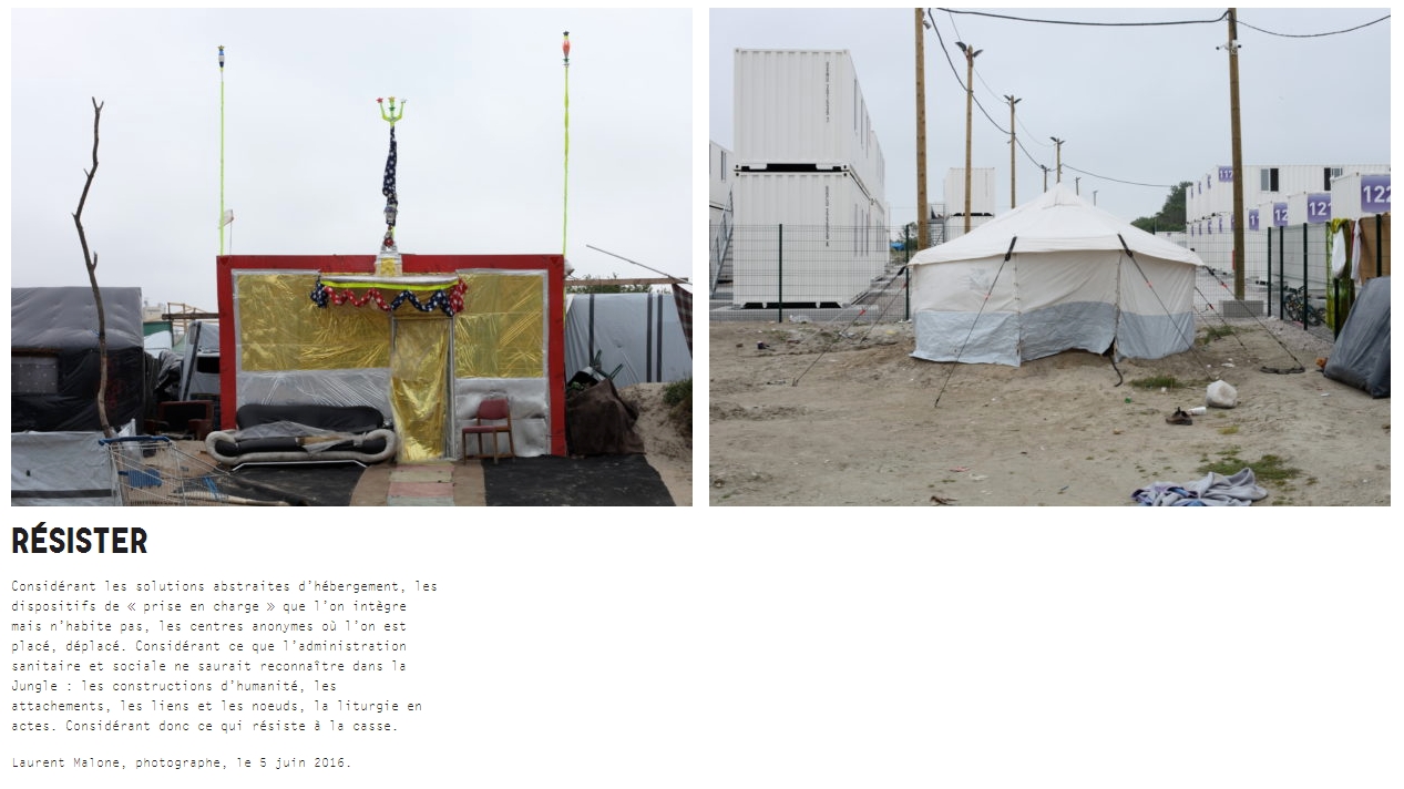 Car notre langue est aujourd’hui d’une pauvreté infinie, inapte à rendre compte de l’épaisseur de l’expérience, de la singularité de ce qui a lieu. Que veut encore dire « informel », quelles formes habitées de la Jungle ne le seraient pas assez pour demeurer officiellement « sans forme » ? Que veut encore dire « pérenne », argument servant à disqualifier non ce qui ne dure pas mais ce qu’on ne veut voir durer, quand le Forum des Halles à Paris ne dure pas 30 ans, et quand l’architecte nous livre du bâti avec une garantie seulement décennale ? Que veut dire encore « nomade », quand on accepte de penser que les sédentaires que nous prétendons être changent d’innombrables fois de lieu de vie durant leur existence ? Trimbaler ces éléments de langage c’est nous assurer de ne rien comprendre à ce qui a lieu à Calais aujourd’hui, c’est demeurer empêtrés dans nos impasses, et ne répéter que des solutions abstraites dont la violence résulte d’abord du fait qu’elles méprisent l’expérience des hommes dont elles sont censées régler les problèmes. Notre langue aujourd’hui écrase la Jungle, avant même que les bulldozers ne passent sur les constructions qui la composent.