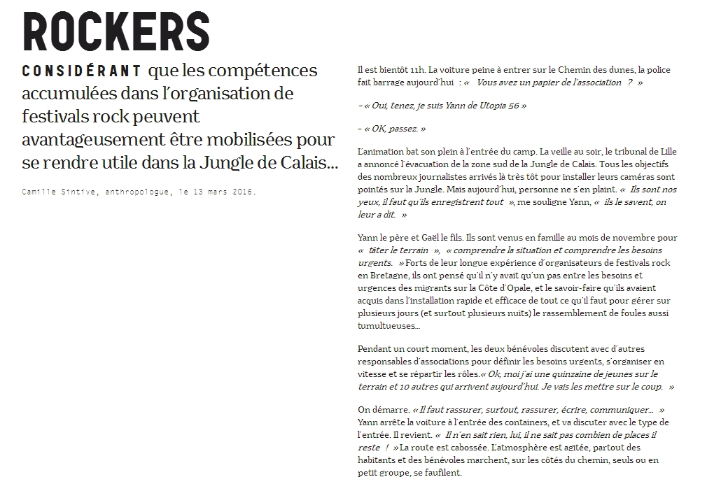 J.S. : Vos actions se rapprochent-elles de celles de Médecins sans Frontières, de Actes et Cités et des étudiants de l’école d’architecture de Belleville qui œuvrent à la construction d’un camp humanitaire à Grande-Synthe ?